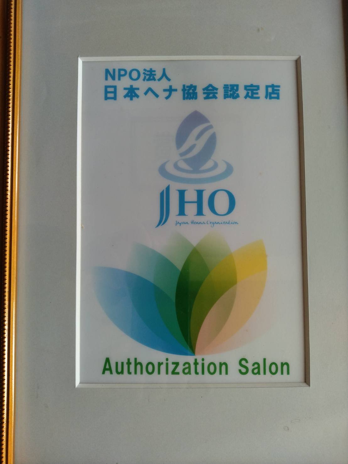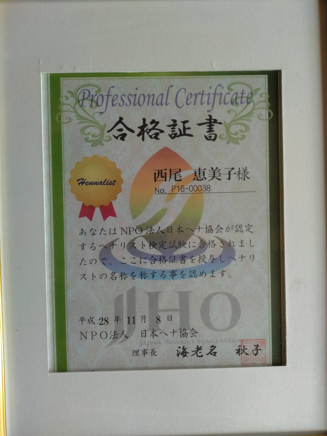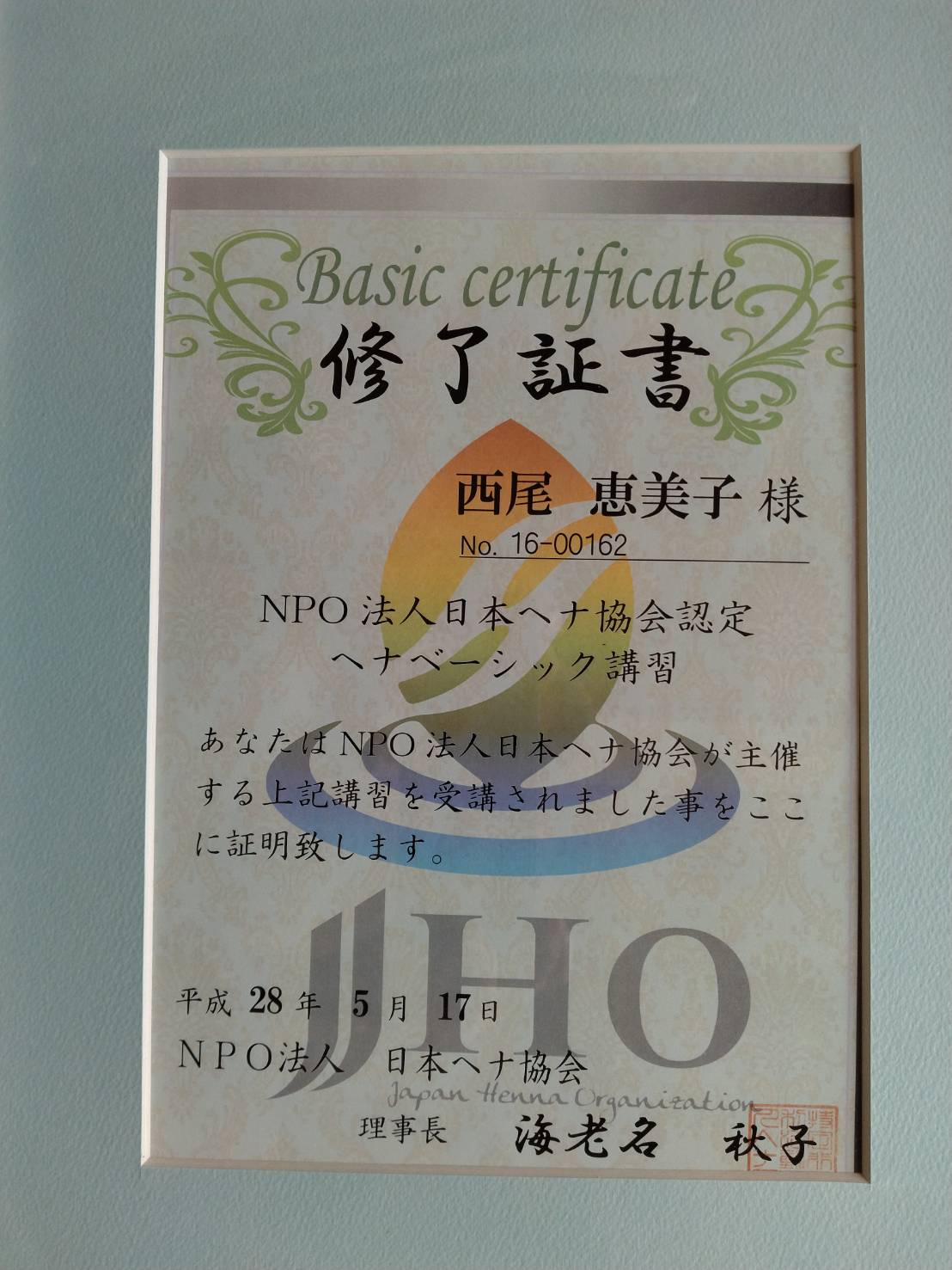 NPO法人日本ヘナ協会認定店の認定証とヘナベーシック講習の終了証です。ヘナ協会での最上級資格のプロフェッショナルの資格も取得いたしました。